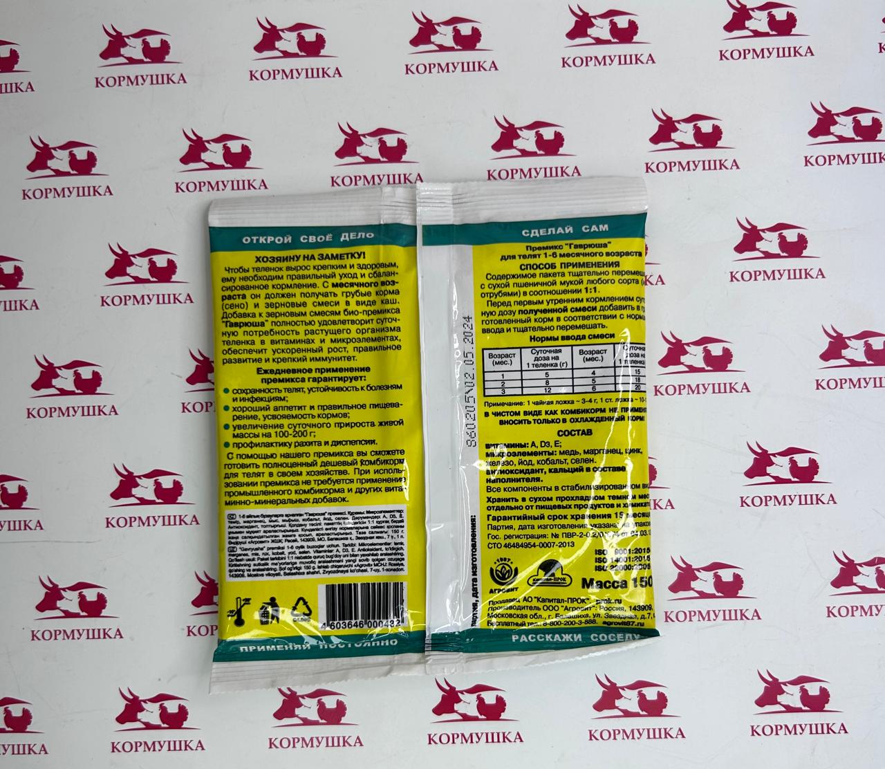 Витаминно-минеральная кормовая добавка в виде премикса для производства комбикормов и кормосмесей для телят 1-6 месячного возраста. Скармливание премикса Гаврюша телятам 1-6 месячного возраста способствует предупреждению заболеваний, вызванных дефицитом минеральных веществ и витаминов, повышению устойчивости организма к болезням, способствует повышению продуктивности, сохранности животных и эффективности использования корма, улучшению пищевой и технологической ценности мяса. Способствует:Микроэлементы: железо, марганец, медь, цинк, кобальт, йод, селен.