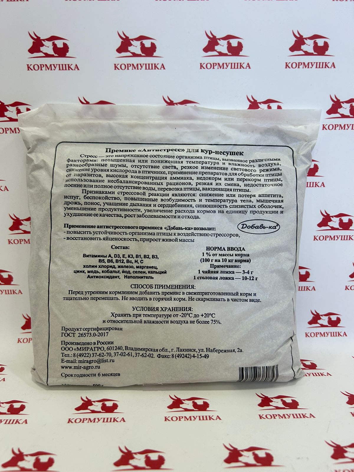 Добавка "ДОБАВЬ-КА" ВМК" укрепляет здоровье кур, защищает от заболеваний: авитаминоза, обезноживания, каннибализма. У кур улучшается аппетит, состояние перьевого покрова, они становятся бодрыми. Элементы, содержащиеся в премиксе, активизируют обменные процессы в организме кур, именно поэтому уже через 7-10 дней вы увидите реальный результат - яйценоскость кур повысится, скорлупа станет прочнее. Добавка не содержит антибиотики, ГМО, химические стимуляторы роста, поэтому яйца остаются такими же "чистыми", вкусными и полезными, как при кормлении только обычными кормами. Состав: 8 витаминов, 7 микроэлементов, специальный комплекс аминокислот и ферментов