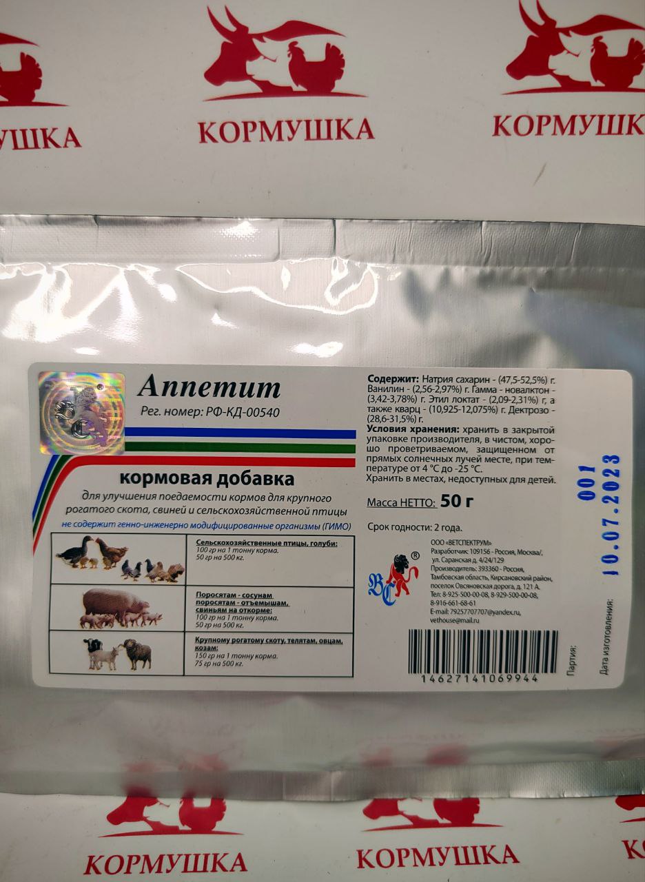 Кормовая добавка "Аппетит" для улучшения поедаемости кормов для крупного рогатого скота, свиней и сельскохозяйственной птицы.